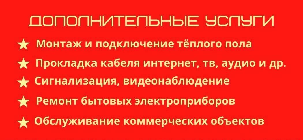 - Монтаж и подключение тёплого пола, - Прокладка кабеля интернет, тв, аудио и др., - Установка GSM - сигнализации, видеонаблюдения, - Ремонт бытовых электроприборов, - Сервисное обслуживание коммерческих объектов